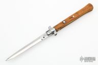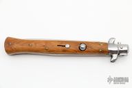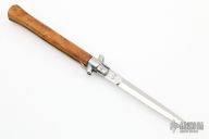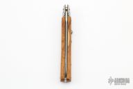 This Swivel Bolster from AB Italy features a stonewashed dagger ground blade with false top edge. The handle is comprised of stainless steel bolsters and olive wood scales over brass liners and steel backspacer. Has some light scratches, otherwise excellent condition. Marked "F/L" on the blade.