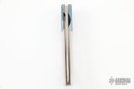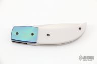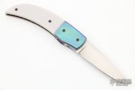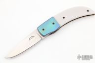 This linerlock folder by the late Stan Fujisaka features a handrub finish drop point blade. The handle has anodized titanium bolsters, corian (?) scales, anodized titanium liners and stainless backspacer. Smooth action with a nice detent, lockup and blade seating. Has some light scuffs throughout, great condition otherwise.