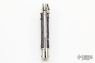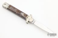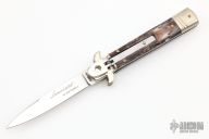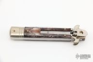 This Leverletto Lever Lock Auto has a mirror polished stainless steel spear point blade. Handle has imitation horn scales, fluted nickel silver front and rear bolsters, stainless steel liners and backspacer, and nickel silver lock release button. Excellent condition.