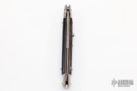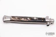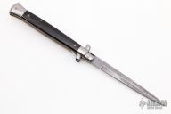 This Swivel Bolster Auto by Frank Beltrame features a Damascus blade with a bayonet style blade with a false top edge. The handle has nickel silver bolsters, buffalo horn scales with brass liners, stainless steel backspacer. Has a couple light scratches, otherwise excellent condition.