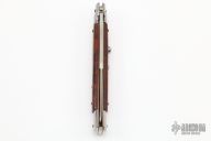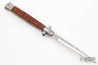 This 11" Picklock Auto by Frank Beltrame features a polished bayonet ground blade with false top edge. The handle has stainless steel bolsters, front and rear, snakewood scales, brass liners, stainless spring. Has a couple light scratches and a crack in the front scale, otherwise good condition.