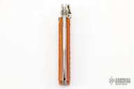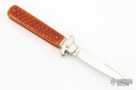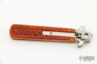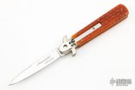 This Leverletto Lever Lock Auto has a mirror polished stainless steel spear point blade. Handle has jigged bone scales, fluted nickel silver bolsters, stainless steel liners and backspacer, and nickel silver lock release button. Has some light scratches, otherwise excellent condition.