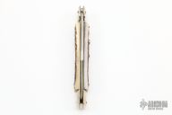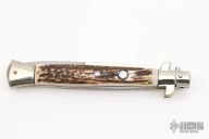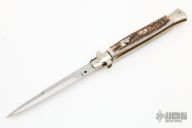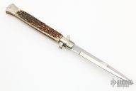 This 11" Picklock Auto by Frank Beltrame features a polished bayonet ground blade with false top edge. The handle has nickel silver bolsters, front and rear, stag scales, brass liners, stainless spring. Excellent condition.