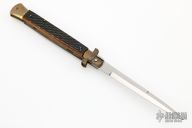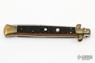 This Swivel Bolster from Stiletto Italy features a bayonet ground blade with false top edge. The handle is comprised of brass bolsters and pommel with jigged bone scales over brass liners and stainless steel backspacer. Has some light scratches, otherwise excellent condition.