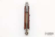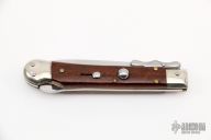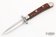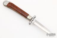 This Automatic knife features a spear point blade with false top edge, nail nick, and nickel silver swing guard. The handle has nickel silver bolsters, front and rear, snakewood scales, brass liners. Has some light scratches and a crack in the front scale, otherwise good condition.