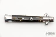 This picklock auto from AB Italy features a spear point blade with false top edge. The handle is comprised of stainless steel bolsters and pommel with buffalo horn scales over brass liners and stainless steel backspacer. Has some light scratches, otherwise excellent condition.