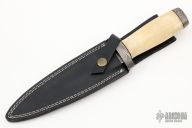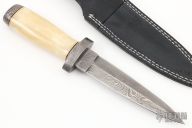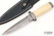 This Dagger (please let us know if you know who made this) features a double edged Damascus blade with .231" blade stock and 1.246" blade depth, hidden tang construction. The handle has a Damascus guard, butt with a smooth grip. Comes with leather sheath. Has scuffs and scratches and some rust on the blade. Great condition otherwise.