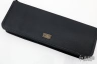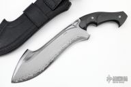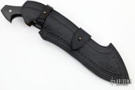This Chopper by CAS Knives features a San Mai Damascus blade with 1095 core and 420 stainless steel cladding, a false top edge, .285" blade stock and 2.676" blade depth, full tapered tang construction. The handle has carbon fiber scales with a single stainless laser engraved pin. Beautifully shaped handle. Comes with a hand tooled black leather sheath that is as stunning as the knife. Comes with leather zippered case. New from maker.