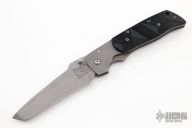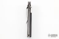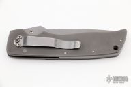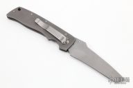 This early folder from Allen Elishewitz features a bead blasted blade with notched thumbrest and single thumbstud. The handle has beadblasted titanium frame and liner, black G-10 scales and an aluminum backspacer. Stainless steel clip positioned for tip down carry. Has some scuffs, otherwise excellent condition. Comes with a nylon belt sheath.