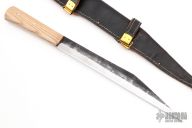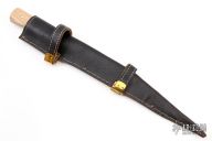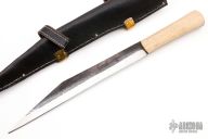 A reproduction of the Viking seax from the 900-1000s that was found at Princes Street in London. We have elongated the tang, making it run through the wooden handle which results in a stronger, more durable item. Grimfrost in runes is stamped into the blade as a makers mark. Comes with a black leather sheath. Has a couple light scratches, otherwise excellent condition.