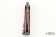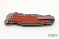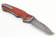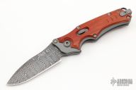 This R.A.M. II features a Damascus blade with swedge. The handle has a bead blast finish titanium frame with wood overlays. Bead blast titanium clip features a spring/piston like mechanism that puts pressure on the end of the clip. The release on the side of the handle allows the knife to close. Smooth and fast flipper opening that requires no wrist action. Another very unique folder from two of the most innovative guys in the business. Has some light scuffs and scratches. Appears to be resharpened. Has some lint in crevasses. Great condition otherwise.