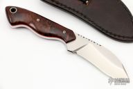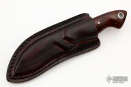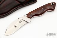 This Pocket Kukri by Graham Knives features a satin finished drop point recurve blade with fileworked thumbrest, .183" blade stock and 1.049" blade depth, full tang construction. The handle has ironwood scales with red liners, mosaic pins and a lanyard tube at the butt. Comes with a black leather sheath with clip. Excellent condition.