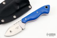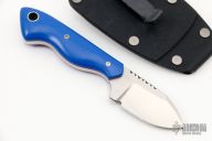 This Razel by Graham Knives features a satin finished blade with a fileworked spine, .182" blade thickness and .997" blade depth, full tang construction. The handle has blue g10 scales with mosaic pins and a lanyard hole. Comes with a custom kydex sheath with pocket clip. Knife has a couple light scuffs otherwise excellent condition.