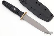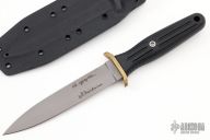 This version is smaller than the original and features a concave back blade. Based on an ancient Japanese spear design, this small and light boot knife is superior in penetration and slashing. When the retired Colonel Rex Applegate handed Boker the prints and design notes for the famous combat knife bearing his name and that of his partner, British Captain W.E. Fairbairn, Boker vowed to stay true to the genius of the original mode, stringently following the original design specifications, with allowances only for the latest in modern materials. The result is the perfect fusion of form and function: The Applegate-Fairbairn Fighting knife from Boker. Its history is compelling: During WWII, commando instructors Applegate and Fairbairn were both assigned to the OSS, the Office of Strategic Services, where they collaborated to improve the Fairbairn-Sykes commando knife, designed for serious hand to hand combat. Boker's reissue of the Applegate-Fairbairn Fighting knife uses the fiberglass-reinforced Delrin handle, thickened in the center for a sure grip. A lanyard hole adds convenience. The handle meets a short, forward bending cross guard that protects the fingers. Boker achieved the knife's preferred rearward balance by inserting lead weights into the handle--a beautifully ergonomic design. Struck of Solingen 440C stainless steel hardened to a Rockwell 58, the blade has the signatures of Rex Applegate and W.E. Fairbairn etched into the bead-blasted finish. Made in Germany. Has a "Besh Wedge" ground blade. Comes with kydex sheath and teklok. Has some light scuffs and scratches great condition otherwise.