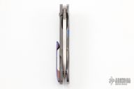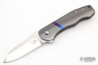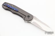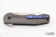 This MB-1 Flipper from Chad Nell features a mirror finished blade with satin flats, notched thumbrest and flipper. The handle has a zirconium front scale with Moire Timascus inlay and tip up clip, bead blasted titanium lockside, lanyard hole at the butt. Nice detent, lockup and blade seating, ceramic bearings. Comes with a zippered case and COA dated 7/16. Excellent condition.