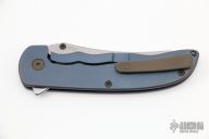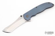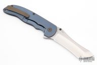 This Norseman (#3965) by John Grimsmo features a stonewashed blade with a single titanium thumb stud, notched thumb ramp and flipper. The handle features anodized finished and crosshatch textured titanium frame with titanium screws. Very smooth action that requires no wrist movement. Nice detent, lockup and blade seating. Rides on ceramic bearings. Knife is in excellent condition, shows no signs of use or carry. Comes with original custom hard case, Nano-Oil, tool, and COA dated September 15, 2020.