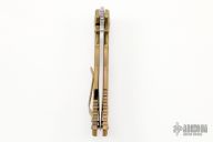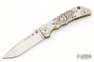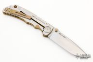 This Harsey framelock folder by Spartan Blades features a stonewashed drop point blade with dual thumbstuds and a notched thumbrest. The handle has an anodized titanium frame with laser engraving, a tip up titanium clip and filler tab. Has nice detent, lockup, and blade seating. Comes with original box. Excellent condition. S45VN