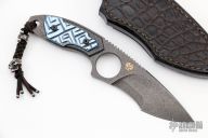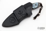 The Phantom I is a limited edition knife from the Law Defender Series Collection, featuring a Darkwater Steel blade and carbon fiber scales with textured titanium overlays. .200" blade thickness and 1.350" blade depth. Notched thumbrest. Lanyard with solid silver skull. 7/8" diameter finger hole. Great fit in the hand. Excellent work. The leather sheath has an exotic leather overlay that is sewn with stainless steel wire. Excellent condition. Comes with a COA.