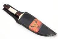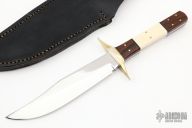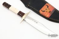This bowie by Tom George features a mirror polished blade with false top edge, .127" blade stock and 1.265" blade depth, full tang construction. The handle has a nickel silver guard, ironwood and mammoth ivory scales with black spacers. Comes with a black leather sheath with painted leather overlay. Excellent condition.