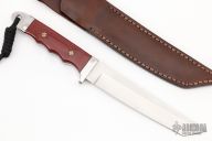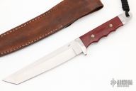 This knife by Jim Ort features a satin finished blade with .143" blade stock and 1.240" blade depth, full tang construction. The handle has a stainless steel guard and rear bolsters, red linen micarta scales with mosaic pins and black liners. Comes with a brown leather sheath. Excellent condition.