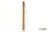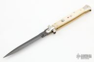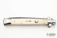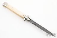 This swivel bolster auto by Latama features a Nichols Raindrop Damascus spear point blade with a false top edge. Nickle silver guard and rear bolster and white scales with red dot. Nice function, strong firing and lock up. Has a few light scratches, otherwise excellent condition.