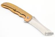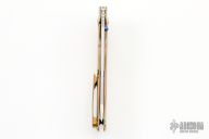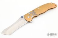 This Norseman (#348) by John Grimsmo features a tumbled blade with a single titanium thumb stud, notched thumb ramp and flipper. The handle features anodized and milled titanium frame with titanium screws. Very smooth action that requires no wrist movement. Nice detent, lockup and blade seating. Rides on ceramic bearings. Knife is in excellent condition, shows no signs of use or carry.