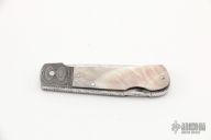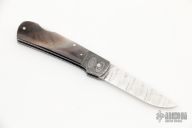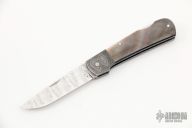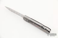 This Lockback by Ken Steigerwalt features a Damascus blade with nail nick. The handle has fluted Damascus bolsters, black lip pearl scales, fileworked stainless steel liners, fileworked stainless steel backspacer. Nice lockup and blade seating. Excellent condition. Comes with a zippered case.