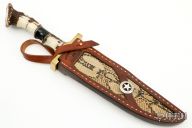This Bowie by Jay Maines features a satin finished blade with false top edge and fullers, .201" blade stock and 1.915" blade depth, hidden tang construction. The handle has a brass double guard, crown stag grip with red/white/blue/brass/buffalo horn spacer pattern and an ammonite fossil inlaid in the butt. Comes with brown leather sheath with snake skin inlays. Has some light scratches, otherwise excellent condition.