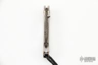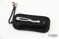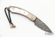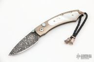 This B09 Kestrel by William Henry features a Stainless Damascus blade with single thumbstud with an opal inset, button lock has same inset. The handle has a super conductor frame with mother of pearl inlays. Comes with black ostrich leather pocket sheath. Excellent condition.