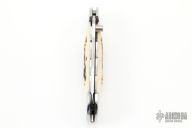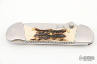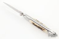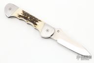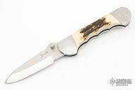 This Lockback by Garle features a two-tone blades with thumbstud. The handle has satin finished stainless steel bolsters with integral fileworked liners, stainless steel backspacers, stag inlays. Nice fit and finish, nice function and blade seating. Has a couple light scratches, otherwise excellent condition. Blade reads "ATS-34SS MICH. 2000".