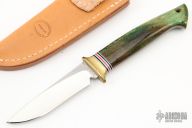 This Hunter by RW Wilson features a mirror finished drop point blade, .122" blade stock and .914" blade depth, hidden/frame tang construction. The handle has a brass guard, giraffe bone scales, red/white/black spacers and frame. Comes with a brown leather sheath. Excellent condition.