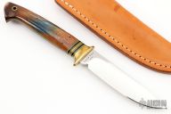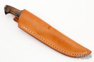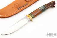 This Hunter by RW Wilson features a mirror finished drop point blade, .130" blade stock and .945" blade depth, hidden/frame tang construction. The handle has a brass guard, giraffe bone scales, brass/yellow/black spacers and frame. Comes with a brown leather sheath. Excellent condition.