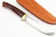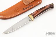 This Hunter by RW Wilson features a mirror finished drop point blade, .114" blade stock and 1.017" blade depth, full tapered tang construction. The handle has a brass guard, stag scales, black spacers and liners. Comes with a brown leather sheath. Excellent condition.