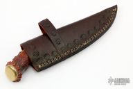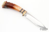 This Hunter by RW Wilson features a mirror finished drop point blade, .157" blade stock and .957" blade depth, hidden tang construction. The handle has a brass guard, crown stag grip with a brass butt plate, black/white/red/brass spacers. Comes with a brown leather sheath, not original. Excellent condition.