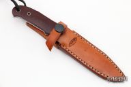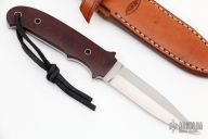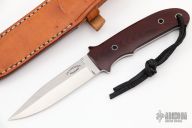 This New York Special by Dietmar Kressler features a hand rub satin finished blade with sharpened top edge, .127" blade stock and .799" blade depth, full tapered tang construction. The handle has maroon linen micarta scales. Comes with a brown leather sheath and a zippered case. Excellent condition.