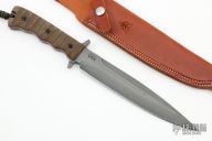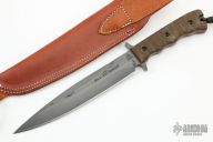 This Wild Pig Hunter by Tops Knives features a "black river wash" finished blade with false top edge, .245" blade stock and 1.309" blade depth, full tang construction. The handle has green canvas micarta scales with red liners. Comes with brown leather sheath. Has some oxidation spots on the blade, otherwise unused condition.