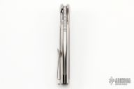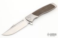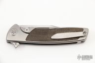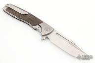 This Evo Typhoon from Brian Nadeau features a satin finish clip point blade with a fuller and thumbrest. The handle is comprised of a bead blasted titanium frame with marble carbon fiber inlays, satin titanium tip up clip. Rides on bearings, nice detent, lockup and blade seating, stainless lockface insert. Includes original box canvas pouch. Has scuffs and scratches and some junk in the crevices. Good condition.
