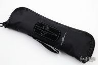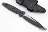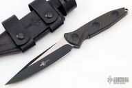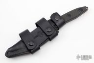 This knife features a two-tone blade with satin flats and black ceramic coated grinds, clip point, notched thumb-rest. 3/16" blade stock and 1 1/8" blade depth, full tang construction. The handle has carbon fiber scales. The tang is notched all around and the is a lanyard hole at the butt. Comes with a black leather sheath and original box. Excellent condition.