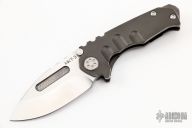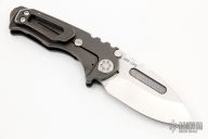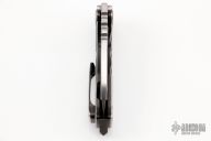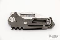 This Micro Praetorian from Medford Knife and Tool features a satin finished drop point blade with notched thumbrest and laser engraved fullers. The handle has a black PVD titanium frame with a matching titanium tip up pocket clip. Stainless steel backspacer doubles as a glass breaker. Comes with original hard case and papers dated June 1, 2022. Excellent condition.