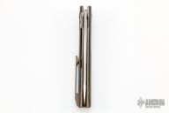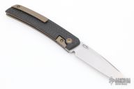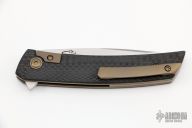 This F22 was designed by Jared Oeser, manufactured by Reate Knives and features Lee Williams Kickstop.  This knife features a satin finished blade with a notched flipper tab.  The handle has carbon fiber scales with a bronzed titanium backspacer, tip up pocket clip and escutcheon. The knife opens with the use of Lee Williams' Kick Stop flipper.  Includes the original box.  New from Maker!