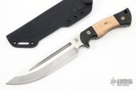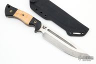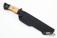 This Honey Badger by Dark Timber Knives features a two-tone blade with satin flats, fullers, .184" blade stock and 1.523" blade depth, full tang construction. The handle has black canvas micarta scales with dovetailed curly maple inlays. Comes with a kydex sheath. Excellent condition.