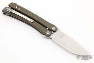 This Model 53 Marlow Mangus has a stonewashed D2 drop point blade with notched thumb rest. Handle is Green G10 with milled contours and titanium back spacers. Polished stainless steel 2-way reversible tip up clip and T-Latch closure. Has a couple light scratches on the clip, otherwise excellent condition. Comes with original box and papers.