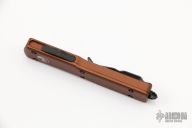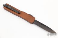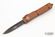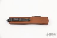 This UTX-70 OTF automatic by Microtech features a S/E DLC finished blade with a standard edge. The handle has a Tan aluminum frame with DLC stainless steel tip down clip. Serial number 10764 and dated 02/2020. Comes with original box and papers. Excellent condition.