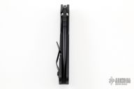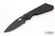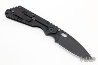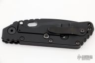This Mick Strider SMF Fatty framelock folder features a black blade with thumbhole and notched thumbrest. The handle has a black aluminum and flamed titanium frame with titanium clip, tip up carry. Zirconium lockbar stabilizer. Jimping on blade spine. Nice lockup, detent, and blade seating. Has a few light scuffs and a couple spots on the blade, otherwise good condition.
