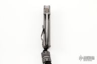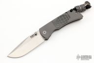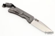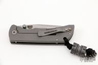 This MAC2 features a tumble finished blade with dual thumbstuds and a notched thumbrest.  The handle features a laser engraved and tumbled titanium frame with a matching tip up pocket clip. Comes with Combat Bead. Includes box and papers. Excellent condition.