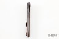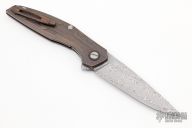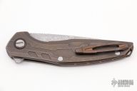 This Custom Division 111 by Shirogorov features a Vinland Damasteel blade with notched flipper and thumbrest. The handle has a milled and anodized titanium frame with a bronze backspacer, pivot collars and tip up clip with hidden screws. RPS pivot system, nice detent, lockup and blade seating. Comes with original box and papers dated 2019. Excellent condition.