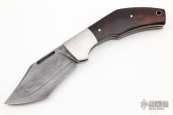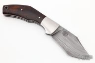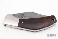 This Superbad Collab by Tashi Bharucha and Franck Souville features a Damascus blade with nail nick. The handle has satin finished stainless steel dovetailed bolsters, ironwood scales, stainless steel liners and spring. Nice strong spring, nice blade seating. Comes with a Velcro case. Has a couple light scratches, otherwise excellent condition.