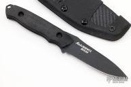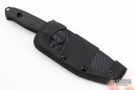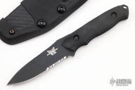This Nimravus cub by Benchmade has a black partially serrated blade with notched thumbrest, .117" blade stock and 1.137" blade depth, full tang construction. The handle has black G-10 scales with lanyard hole at the butt. Comes with a kydex sheath. Has a few light scuffs, otherwise excellent condition.
