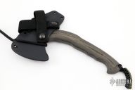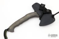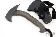 The WK RnD Sub-Compact Models are intended for concealment, or as part of a lightweight bug-out bag. It is a quick handling and powerful tool that can make a difference in out of the ordinary situations. The WK RnD Axe Series is a collaborative design between Master Bladesmith Daniel Winkler and skilled Sayoc Kali martial arts trainer Rafael Kayanan. The handle design provides a standard grip position, as well as a secondary close quarter grip that was developed to emulate the feel of a handgun grip. The optional front spike is a valuable feature in combat usage. Axe Specifications Axe steel: 80CrV2 Black oxide no-glare finish Head length: 4 5/8" Overall length: 9 1/8" Blade thickness: 1/4" Skeletonzied full tang Sheath Fast draw carrier Lined Kydex® HD shockcord quick-release retention system Nylon belt straps with Mil-Spec Pull-The-Dot™ snaps Designed for multiple carry options (See our Info page for carry options) Excellent condition.