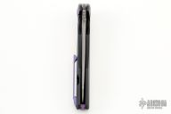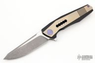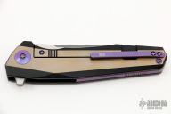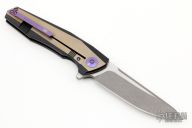 This framelock flipper by WE Knife features a two-tone blade with notched thumbrest and flipper. The handle has a milled and anodized titanium frame with anodized hardware. Rides on bearings, nice detent, lockup and blade seating. Has some scratches, otherwise excellent condition.
